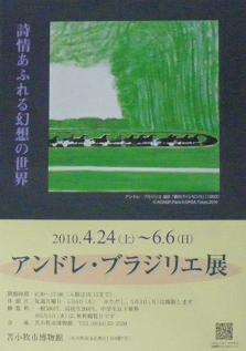 1929年フランスのアンジュー地方生まれ。生まれ故郷のアンジュー地方や、タルドノワ地方を背景とした風景、女性、馬などをモチーフに描いたものが多い。 今回は苫小牧市民から寄贈のあったの作品を公開する。1970〜1988年のリトグラフ、油彩画と、アラン・フルニエ著の青春小説「モーヌの大将」の挿絵である。 ![]() とにかく文様の世界といっていいだろう。「サーカスの馬のロンド」は炎と馬の影だけで構成されている。 描かれている時期が集中しているのかもしれないが、まず立ち並ぶ並木があり、その奥に一本の道があり、馬が5〜9頭同じ方向に走る。馬は影であり、騎手も同様でその一人と一頭に個性はない。「ネプチュームの馬」は雪原の行進であろうか、青との対比が美しい。 いずれもが、しかし黒が多いが、赤や茶色の影が整然と、鬱蒼とした木々の中を駆け抜けるのである。「アイルランドの騎馬行列」もそうした一枚で、そこには風が孕んでいるとしか言いようがない。かなり特徴的な様式美。 開催は6月6日迄 観覧料 / 一般 300円 苫小牧市博物館 |