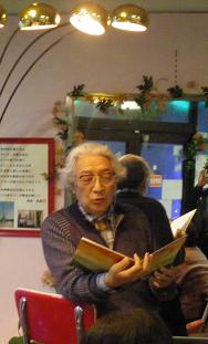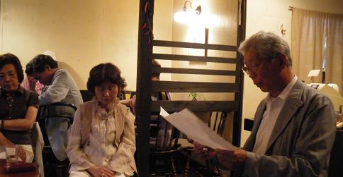 恵庭市民文藝の会会長の村上利雄氏の挨拶と乾杯の後、詩の朗読。 最初の詩は国府田稔氏、自作詩「生ける証し」。まさにこの時、この場所でなんのために声を出すのであろうか、ここ恵庭のカフェ・パリの空の下でとの思い。ここでの出会いそのものを、証しをたてる今。次いで市民文藝の会員である岩井利海作品の「カリンバの恋」を朗読した。 ![]() 朗読 国府田稔氏 会場”カフェ・パリの空の下で”の店長でもある、小川恵里香氏は堀口大学訳詩「ミラボー橋」と金子由佳利作「人生は美しい」を歌うように。小山忠弘氏は、はっきりとした声で「手紙-親愛なる子供たちへ」と「世界に一つだけの花」の音楽作品を朗読された。 武井路子氏は伸びやかな声で、北海道の農業従事者でもある山田伍市作品「ボクと妻」を、リクエストでは栗山在住の友田多喜雄作品「雪のうた」を紹介。 半澤孝平氏は市民文藝増刊22号に掲載した自作詩、苺を取られて悲しがる作品「ショートショート」ケーキと、一人住まいの台所事情の詩「年々菜々」を。さらにリクエストで、猫のことを書いた作品「まばたき」も披露した。 ![]() 朗読 半澤孝平氏 岩井利海作品は人気で、斉藤えり子氏も詩作品「おにぎりの詩」と「かあさんの詩」を声にする。「おにぎりの詩」は運動会の歓声のなか、手のひらで包み込んだお握りのその温もりが感じられる作品であった。斉藤えり子氏は、欠席となった庄司トモ子氏が用意していた詩作品「アマリリスの側で」も代読した。 村田譲はレクイエム作品「来訪者」、並びに春の作品「水のオルガン」を披露。 さらには参加者の中からも朗読したいと飛び入り、またシャンソンを歌われる方の美声で、大いに盛り上がった。その後、向かいの岩井利海氏のお店で、楽しくお酒と朗詩の時間を過ごしたのである。 |
