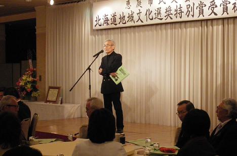 ![]() 恵庭市民文藝の会・受賞の盾と賞状 賞は、北海道の地域に誇りと愛着をもって文化活動に取り組む団体として、広く道民に紹介、その活動が益々牽引力として広がることを期待するものとして授与される。この受賞を記念した祝賀会が開催された。 花束贈呈では当日参加した市民文藝の会員全員が壇上に上がり、高橋事務局長が会員を紹介、村上会長が謝辞を述べられた。 ![]() 祝辞 / 北海道立文学館理事 斉藤征義氏 村田譲は、祝杯の前に詩の朗読の時間を与えられ、市民文藝増刊13号に掲載した「春の入口」、並びに恵庭のカリンバ遺跡をモチーフとした「カリンバのまどろみ」の二篇を披露した。ちなみにカリンバとは、桜の樹皮のことである。 |
