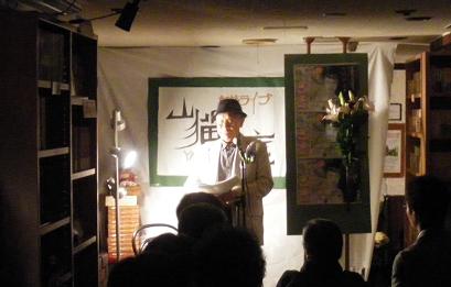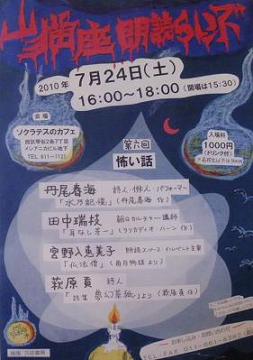 六回目の山猫座のテーマは「怖い話」。室内の照明を落とし、廊下からの窓の明かりを補助にして、スポットで絞る。 俳句と詩を書くパフォーマーの丹尾春海氏は、当初は聴衆の前に姿を現さずに、奥のカーテンの裏から声だけを震わせていた。話がやや進んだところで、出てきたときは金色のマスクを被り、自作の「水乃記憶」を披露した。 ![]() 次いで朝日カルチャー講師の田中瑞枝氏が、幼い命を思ってか、喪服の着物姿で朗読を始める。鬼火の前に、寺男たちの声に耳も貸さず、狂ったように琵琶を引き続ける。出かける用事のある和尚は、般若心境を足の裏まで書きつけながら、耳に書き忘れていることに気付かなかったのだ。ラフカディオ・ハーン著「耳なし芳一」。 朗読スペース・イルペント主宰の宮野入恵美子氏は、雨月物語より「仏法僧」を選んだ。太閤秀吉の甥である豊臣秀次は、よく分からない罪状で京の三条河原に首を晒された。恨みの首塚に引き寄せられた、出家の夢然が歌を賞賛されるという話。 ![]() 朗読 / 萩原貢氏 詩人の萩原貢氏は、自作の詩集から『夢幻草子』からの声を出す。忘れるな、黒髪を、細い体を、知られたくない土の下の隠れ家を。それは、うたた寝、いやな記憶から這い出てくる。おいしいはずの、ご飯を炊いて。白いご飯を炊いて、目をつむって食べる。つむる目からご飯がこぼれて、白いご飯が蠢いて、這い出して。こぼれ落ちる白い小さなツブ。鼻の奥からもこぼれてしまう、白いマンマ。 |