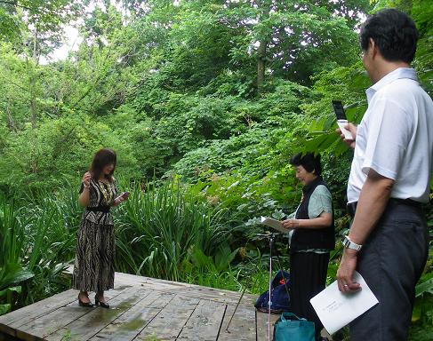 「山の街から」主宰の永井ますみ氏が来道され、札幌オフ会が開かれた。まずは各人による連詩の録画である。当日北海道からは、みど氏、ちえ氏とムラタが参加した。 朗読場所は北海道大学植物園の園内と決まった。どうも私はここの植物園を他の所と勘違いしていたようだ。足の向くまま車道の音が割りと小さくなる所まで歩き、沼に架かる木道の上、ややスペースのある場所をステージに見立てて、朗読開始である。太陽の方向といい、緑の加減といい雰囲気がなかなか素敵だ。まず時間に追われているムラタが声を上げる。 ![]() 次いで、ちえ氏の朗読が収録された。声の出し方、内なる声を表すにはどうするかを語りながら。小声で、右を向いて、キーを高く、屈みながら、アイツの顔を思い浮かべてと、その場で実践である。 当日ムラタは他の会場を掛け持ちであったので、そこで移動。その後、みど氏も園内で録画してから、場所を代えて「生活語詩収録」が行なわれたとのこと。原子修氏、増谷桂子氏が参加。 あいにく原子氏は所要があるとのことで、その後の打ち上げは、戻ってきた私を含め五名で、散々飲み明かしたのである。 |